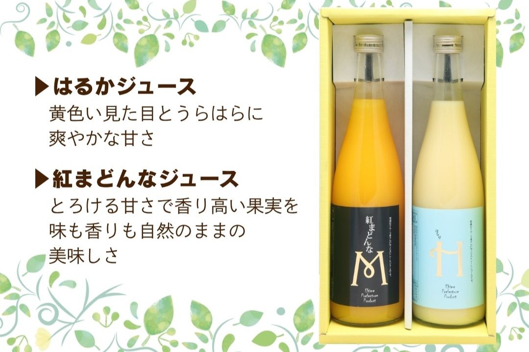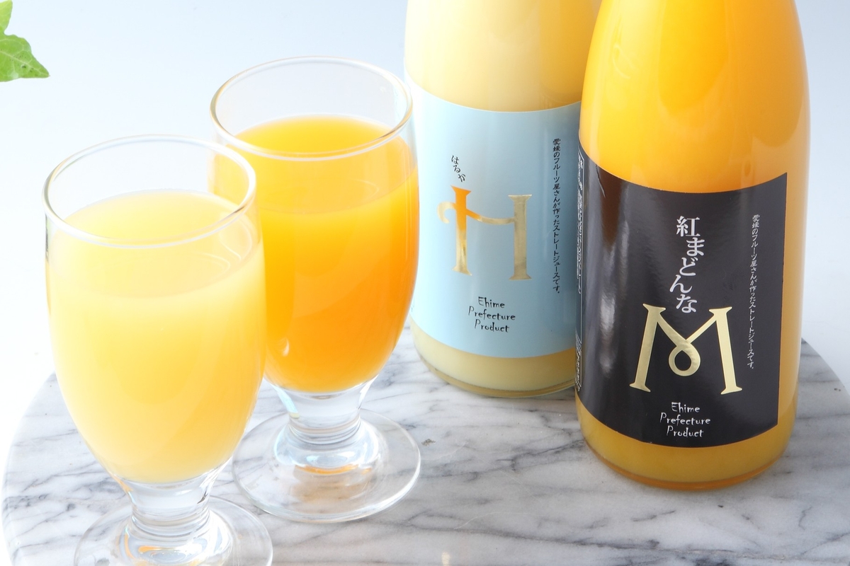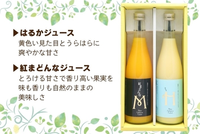 黄色い見た目とは裏腹に爽やかな甘さが美味しいはるか、とろける甘さで香り高い仕上がりの紅まどんなを、味も香りも自然のままの美味しさで、家族みんなで楽しめる100%ストレートジュースです。